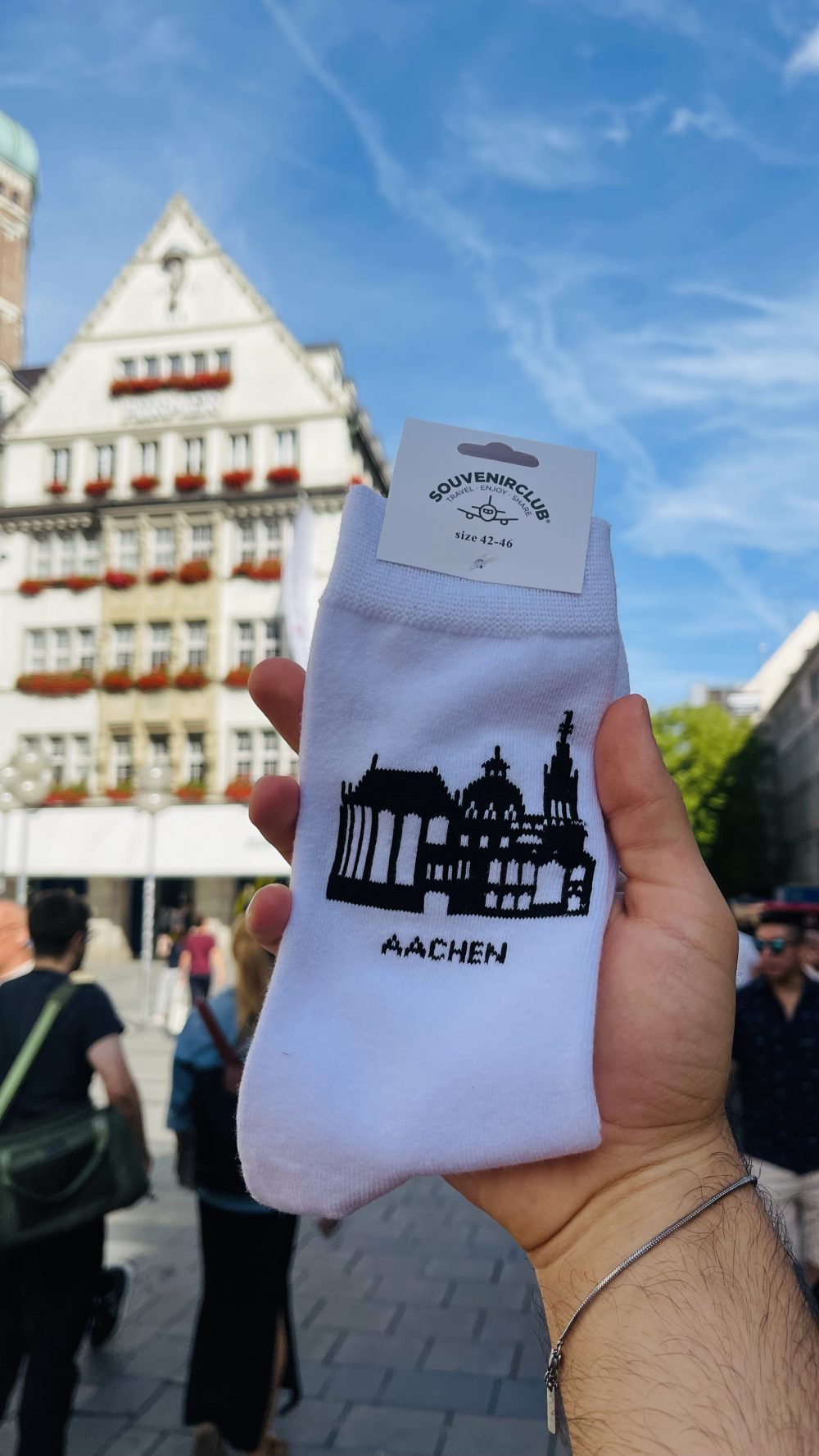 Treten Sie ein in den Charme Aachens mit diesen stilvollen Souvenir-Socken, die eine Illustration des berühmten Aachener Doms zeigen. Diese Socken sind eine gemütliche Erinnerung an die reiche Geschichte und Architektur der Stadt. Für höchsten Tragekomfort gefertigt und mit Reisefreunden im Sinn entworfen, sind sie das perfekte tragbare Andenken für alle, die ein Stück Aachen immer bei sich tragen möchten.