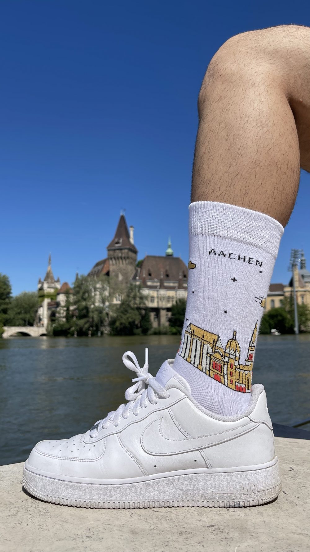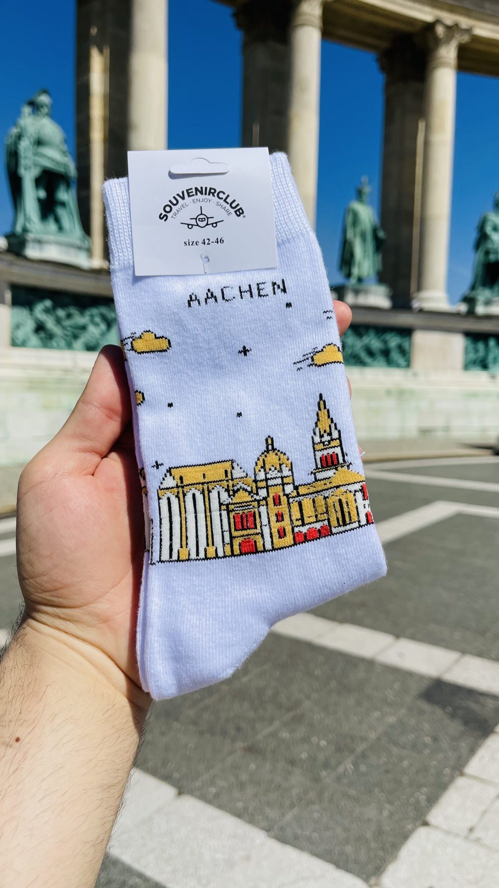 Treten Sie ein in den Charme Aachens mit diesen stilvollen Souvenir-Socken, die eine farbenfrohe Illustration der ikonischen Skyline der Stadt zeigen. Mit Wahrzeichen wie dem Aachener Dom und dem Rathaus in verspielten Details sind diese Socken eine gemütliche Erinnerung an die reiche Geschichte und Architektur der Stadt. Für höchsten Tragekomfort gefertigt und mit Reisefreunden im Sinn entworfen, sind sie das perfekte tragbare Andenken für alle, die ein Stück Aachen immer bei sich tragen möchten.